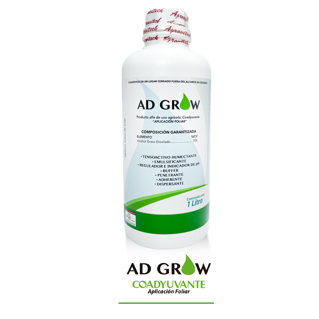 AD GROW reduce y elimina muchos de los problemas de las aplicaciones de herbicidas, insecticidas, fungicidas, fertilizantes foliares, hormonas, modificando las características físicas de la mezcla de aspersión ayudando así a mejorar la efectividad o eficiencia de aplicación con un mejor recubrimiento de la super- ficie aplicada.