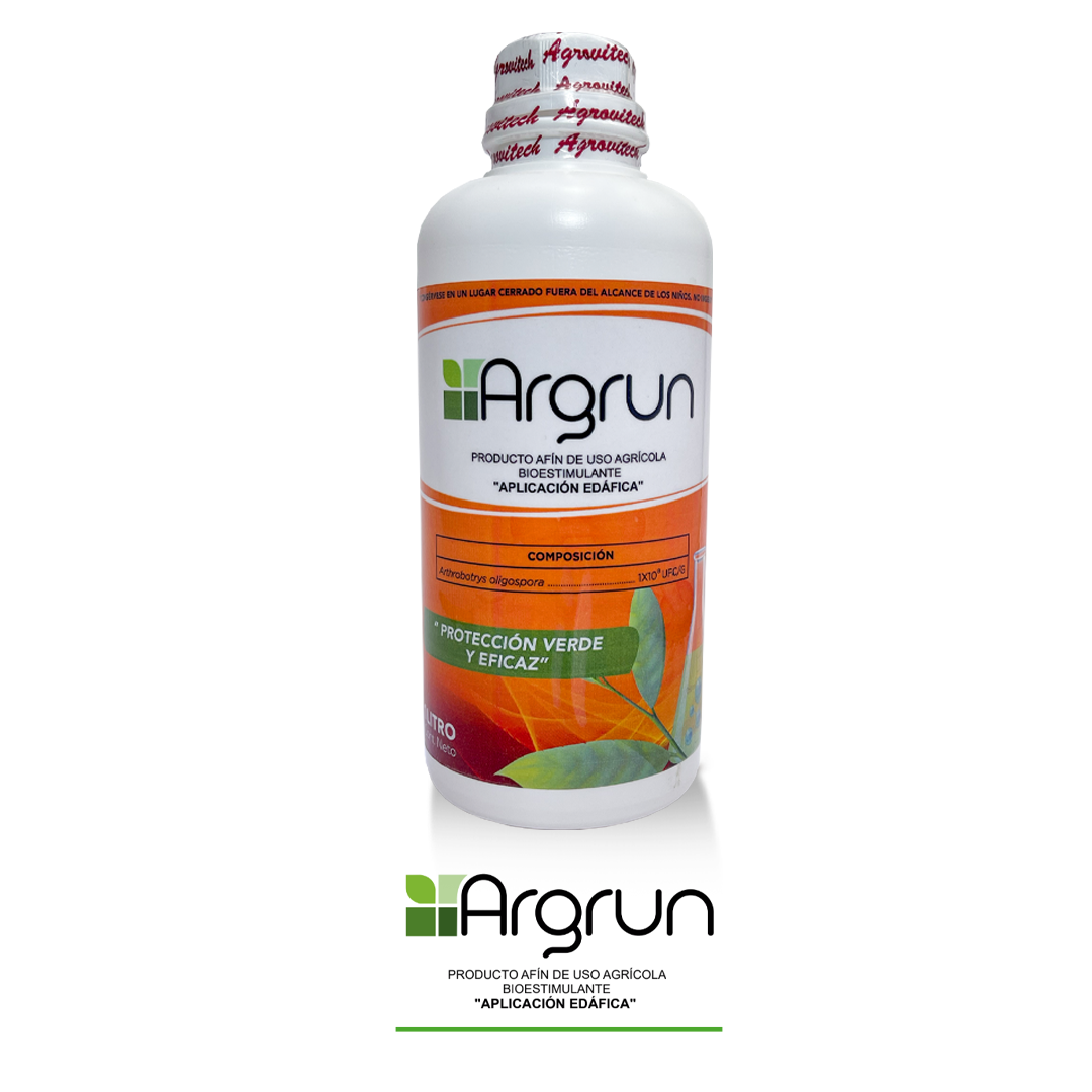 ARGRUN es un producto biológico que contiene conidias del hongo Arthrobotrys oligospora cuya función es capturar y matar nemátodos fitopatógenos, siendo efectivo contra nemátodos juveniles y adultos.