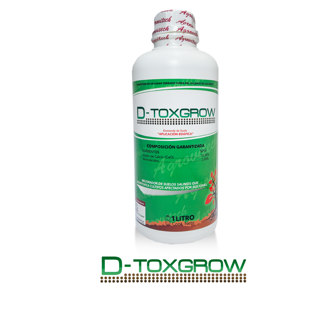 D-TOXGROW es un corrector de suelos salinos, salino-sódicos y también ayuda a desintoxicar cultivos cuando estos han sido intoxicados con iones metálicos, cuando se tienen condiciones de aguas de riego con altos contenidos en sodio, cloro y magnesio y en cultivos conducidos en medios de elevada C.E.